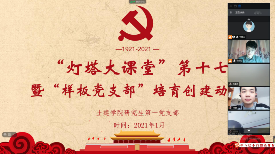为进一步规范党支部的组织生活,提高支部党员的理论学习水平,深入推进“研究生样板党支部”的培育创建工作,确保党员队伍放假“不掉线”。1月28日下午,土建学院研究生第一党支部通过腾讯会议线上召开支部大会,集中组织学习了“灯塔大课堂”第十七讲,并就“研究生样板党支部”的创建工作作了动员,研究生第一党支部全体党员、学工办老师沈娇及部分入党积极分子代表参与了本次会议,会议由党支部书记韩一鸣主持。