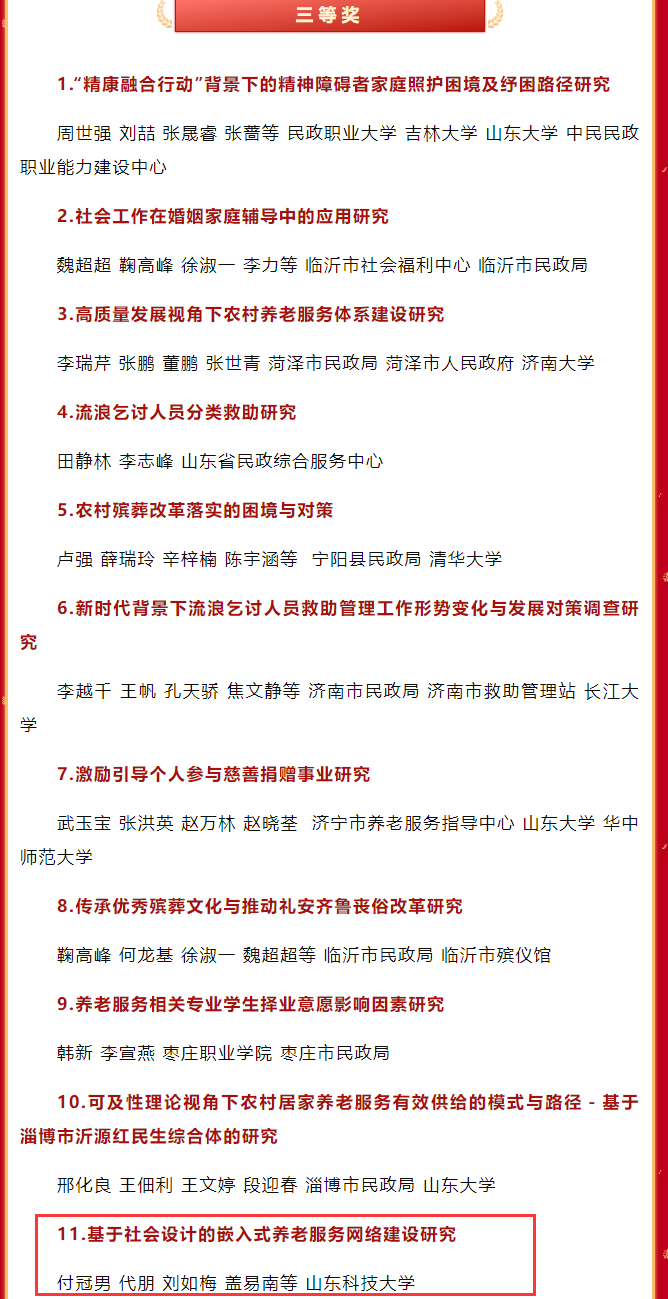 近日,民政部在北京举办2024年“全国民政论坛”,民政部党组书记、部长陆治原出席论坛并讲话。本次论坛公布了2024年民政政策理论研究获奖名单,我院付冠男、代朋、刘如梅、盖易南等完成的“基于社会设计的嵌入式养老服务网络建设研究”荣获三等奖(山东科技大学为第一单位)。