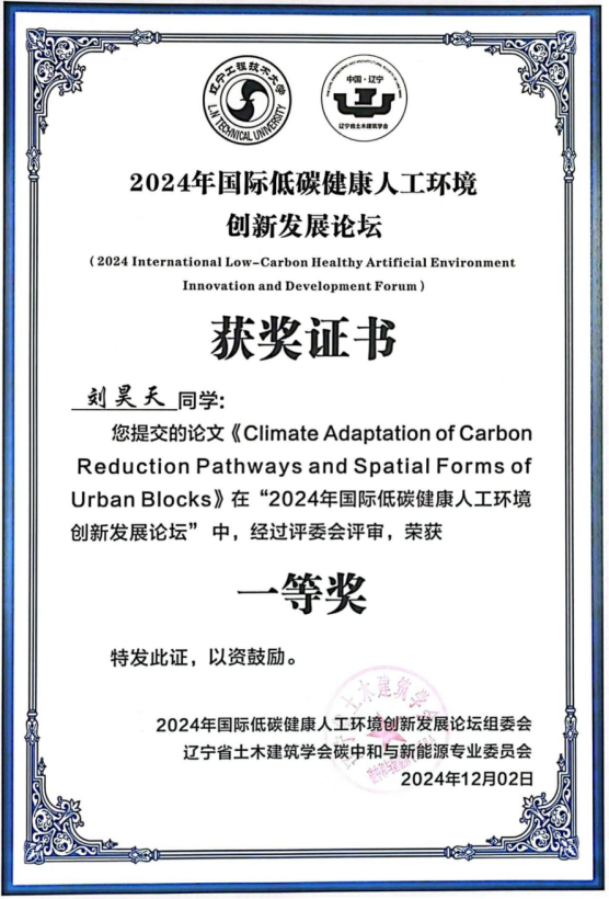 土木工程与建筑学院代朋教授和硕士研究生刘昊天应邀参会,刘昊天同学做了题为《Climate Adaptation of Carbon Reduction Pathways and Spatial Forms of Urban Blocks》的专题报告,同步提交的论文被大会评委会评为一等奖。