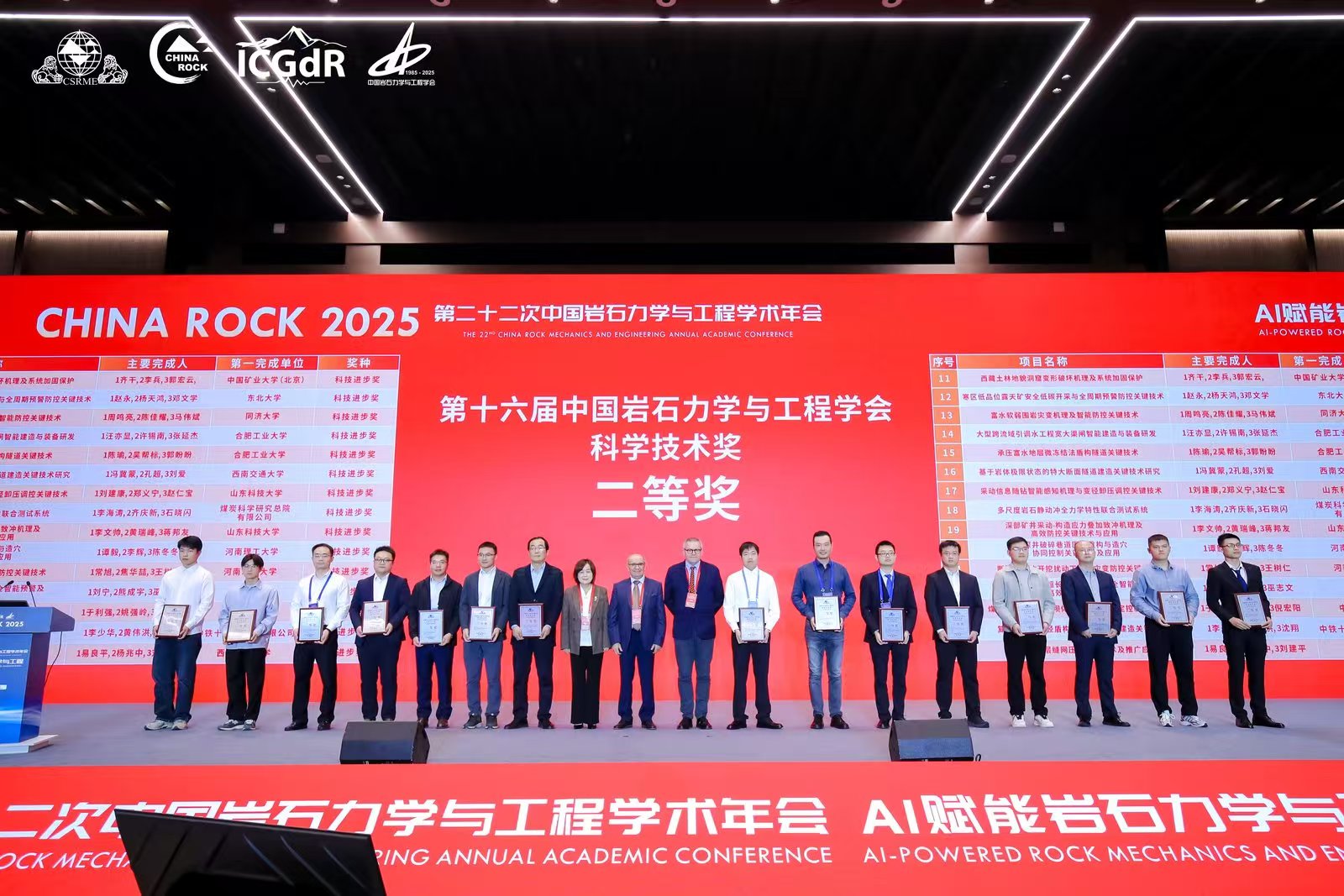 10月18日,CHINAROCK2025第二十二次中国岩石力学与工程学术年会在河北雄安隆重召开。会议期间,中国岩石力学与工程学会举行了2025年科学技术奖颁奖仪式,我校作为第一完成单位,我院李文帅教师主持完成的“深部矿井采动-构造应力叠加致冲机理及高效防控关键技术与应用”项目获科技进步二等奖、黄娜老师作为主要完成人完成的“岩质隧道地震动灾变理论及吸能减震设计方法”项目获自然科学二等奖。