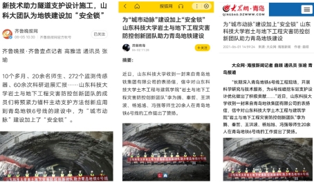 近日,山东科技大学收到一封来自青岛地铁集团有限公司的表扬信,信中对土木工程与建筑学院“岩土与地下工程灾害防控创新团队”师生20余人在青岛地铁6号线的工作提出了赞扬。近日,该团队事迹材料先后被山东科大报、大众网、搜狐网等多家媒体宣传报道,《新技术助力隧道支护设计施工,山科大团队为地铁建设加“安全锁”》被齐鲁晚报、半岛壹点报、山东热搜等多家媒体宣传报道。