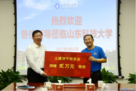 9月25日,土建学院校友捐赠仪式在校举行,校党委常委、副校长张英杰出席仪式并座谈交流。日照市政集团副总经理牟军、爆破分公司经理焦淑军,土建济宁校友会会长徐炳辉及副秘书长满忠相,青岛瑞翰科技集团总经理吕汝贵,淄博大源城建开发有限公司总经理张允胜等校友企业和校友会代表参加仪式。土建学院党委书记宋西路主持捐赠仪式。
