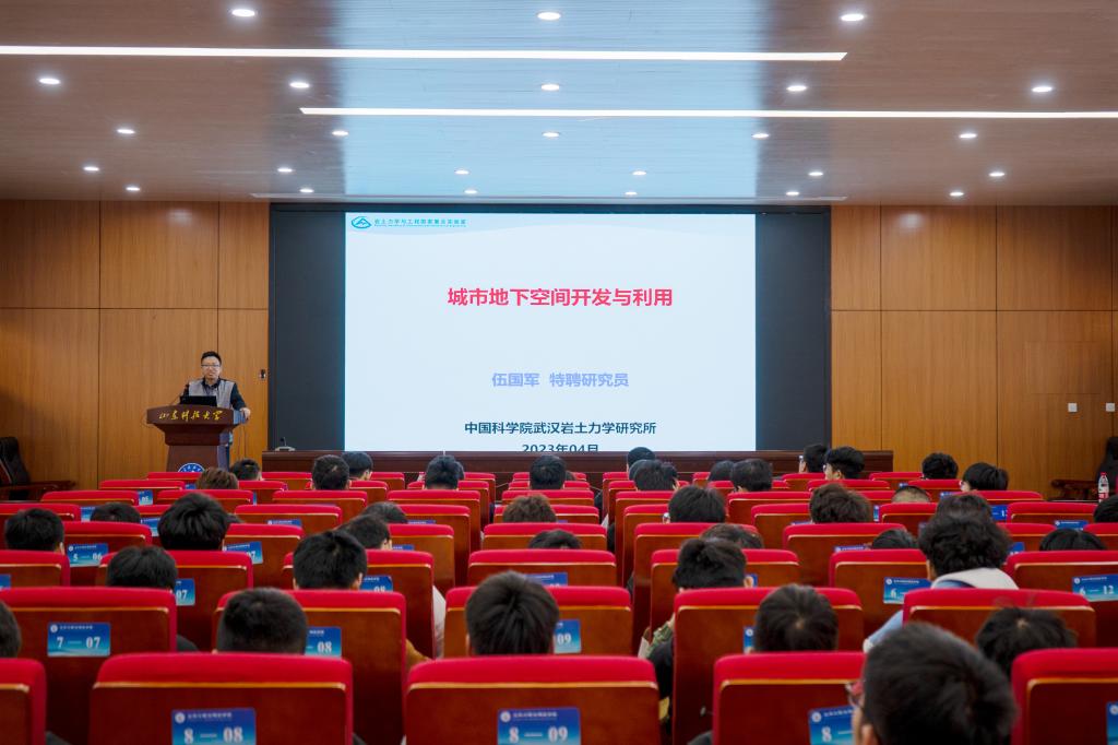 伍国军研究员以《城市地下空间开发与利用》为题,从城市地下空间发展前景、开发优势、开发需求、利用情况、当前问题以及团队介绍六个方面进行了具体的讲解,强调了岩土工程和城市地下空间工程的广大前景,希望同学们能博学笃行、知行合一。刘滨研究员就《地下工程施工过程“人-机-岩”信息互馈机理及智能化决策》这一主题,提出了“复合地层隧道掘进机安全高效施工”这一科学目标,并介绍了其研究方向、系所情况、团队情况等内容。赵亮为在场师生介绍了中国科学院武汉研究所的基本情况,从规模、师资等方面展开,带领同学们熟悉和了解中国科学院最新研究生招生政策。会后,中科院武汉岩土所一行领导及专家参观了我院实验室、院史馆等。