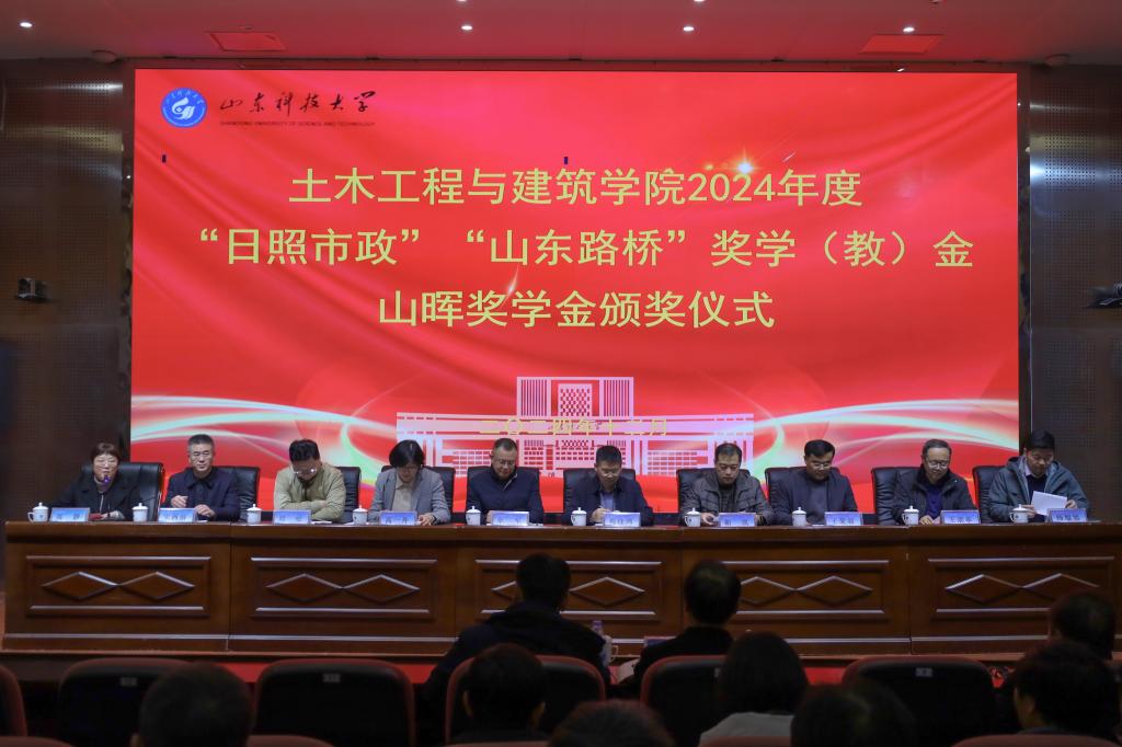 12月25日,土建学院在J9-144报告厅举行2024年度“日照市政”“山东路桥”企业奖教学金和山晖奖学金颁奖仪式。校团委书记高一丹,学生工作处副处长靳凯,研究生工作部副部长刘松,合作发展处副处长王荣超,日照市政工程集团常务副总经理牟军、安全部部长阚卫国、矿井建设2007级校友焦淑军,山东省路桥集团青岛分公司党总支委员、总工程师梅佳鸿,土建学院党委书记宋西路,院长王崇革,党委副书记、副院长高静,副院长、山晖团队党支部书记杨旭旭及师生代表参加了颁奖仪式。仪式由高静主持。