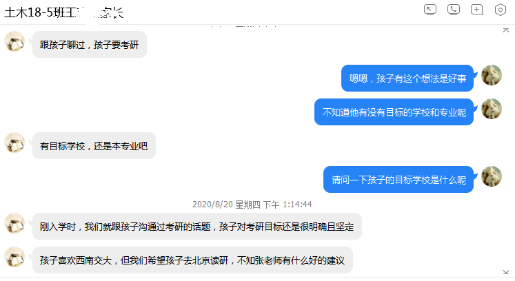 8月份,土建学院学生工作办公室各辅导员通过线上家长会、家长群、电话家访、微信一对一沟通等方式,根据学生具体情况和所处年级和时期,沟通了解学生在家期间的学习生活情况和生活动态,反馈学生在校期间表现,询问家长对学生的培养理念和期望,并给予建议。辅导员鲍娜娜在城乡规划和建筑学专业线上家长会上,向家长们介绍了2015级毕业班的就业与考研情况,并针对考研录取率背后折射出的原因和问题提醒家长们要根据学生实际学习状况规划合理目标、做出最佳选择。