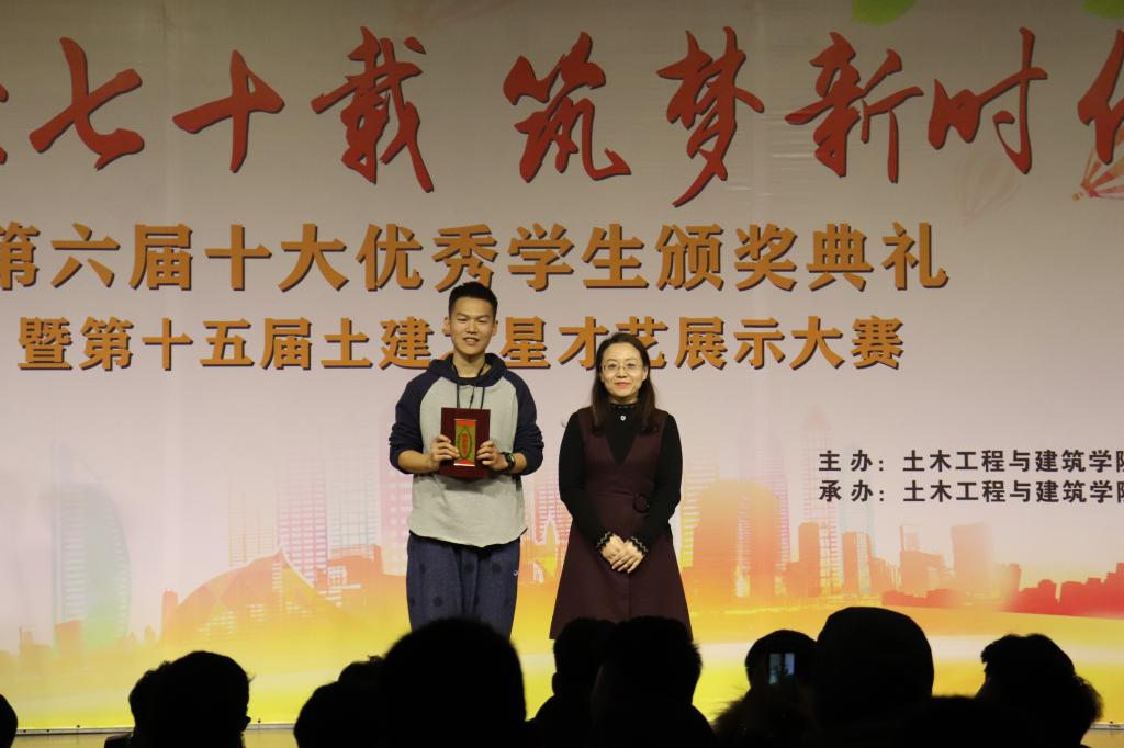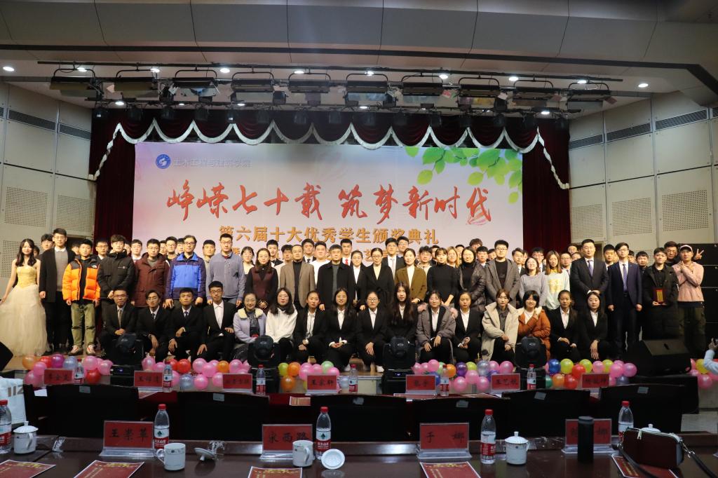 12月3日,土建学院于大学生活动中心隆重举行第六届“十大优秀学生”颁奖典礼暨第十五届“峥嵘七十载 筑梦新时代”土建之星才艺展示大赛。土建学院党委副书记(主持工作)宋西路、院长王崇革、团委书记于娜及全体专兼职辅导员到场观看。