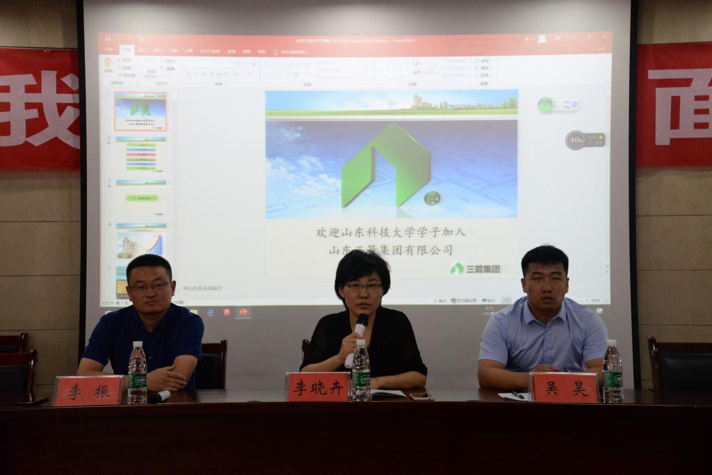 论坛以李晓卉对三箭集团的介绍切入,他详细介绍了企业当前取得的资质和认证,以及企业所涉及的行业领域和国内市场,简单概述了公司项目工程的具体内容和进展,使在场同学们初步了解了集团悠久的发展历史和雄厚的综合实力。随后,李处长从五险两金、薪酬标准、奖惩机制等方面讲述了公司福利政策;向同学们介绍了公司招聘的专业范围、基本要求以及合同签署的时间和种类。李振总经理讲述了自己毕业时在工地的经历,很好地激励了同学们。
