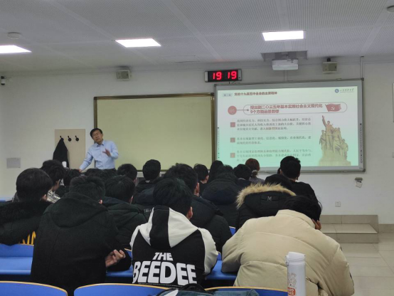12月11日晚上,基建处处长吴正龙为联系班级土木工程18-5班宣讲对党的十九届五中全会精神,土建学院学工办辅导员张翌主持会议。
