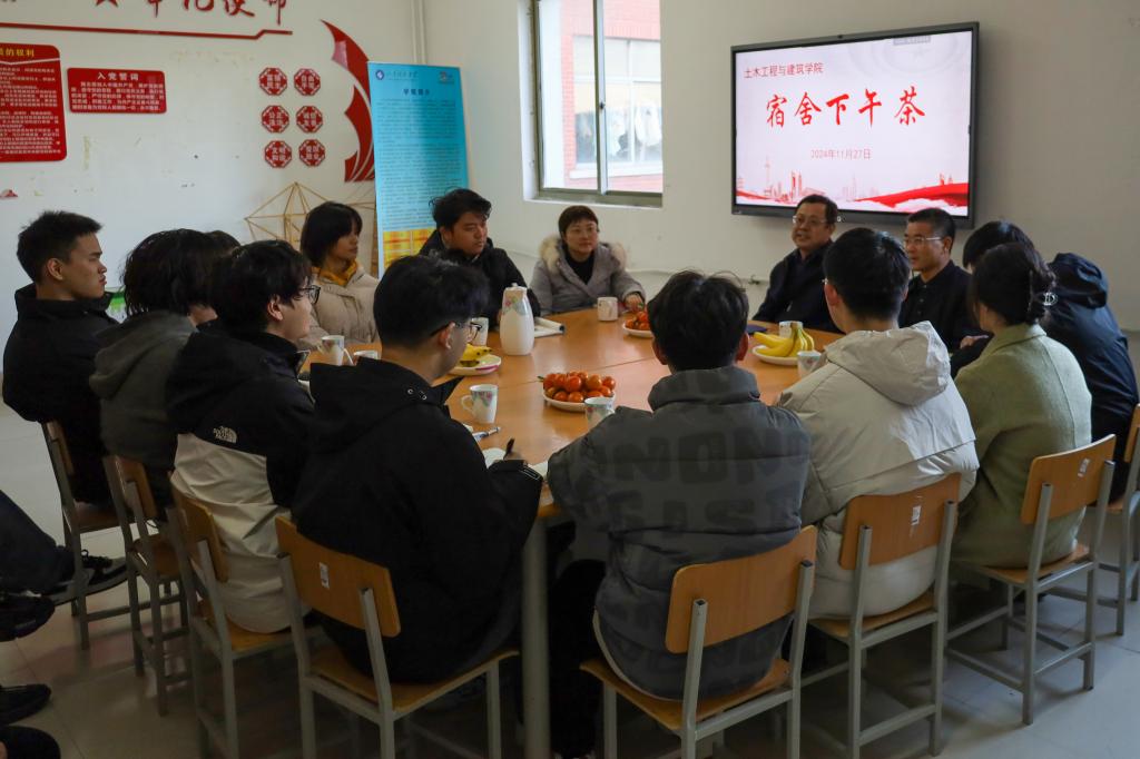 11月27日下午,校党委统战部常务副部长王永君做客土建学院“宿舍下午茶”,与所联系班级土木工程2022-1班的同学们开展了一场亲切且深入的座谈交流活动。学院党委书记宋西路,党委副书记、副院长高静,学工办主任、团委书记王贝贝,辅导员老师李宏宇陪同参加。