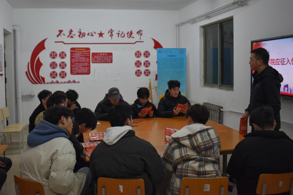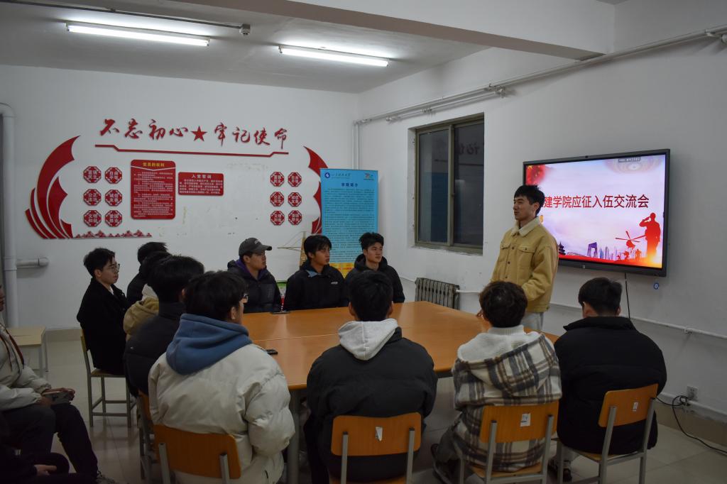 为进一步贯彻落实国家征兵政策,积极动员学院青年学子踊跃报名参军、献身国防,12月18日,土建学院于GB2宿舍楼党员之家举行应征入伍交流会,团委辅导员老师王瑜,退伍复学学生代表尹国鹏、张泽培以及有意愿入伍的同学参加会议。