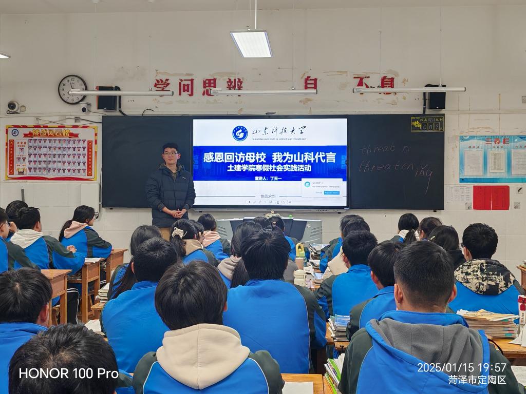 2025年寒假,土木工程与建筑学院积极组织学生分赴黑龙江省、安徽省、福建省、云南省及山东省各地市开展“感恩回访母校,我为山科代言”寒假社会实践活动,同学们满怀热忱地自由组队,带着对高中母校的眷恋与感恩,踏上了意义非凡的回访母校之旅,开启了 “感恩回访母校,我为山科代言” 的寒假社会实践活动。