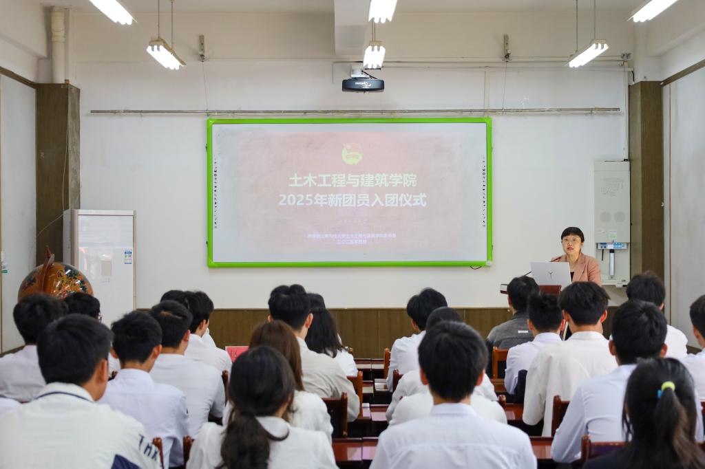 4月28日,为进一步加强共青团队伍建设,引导青年学子坚定理想信念,传承红色基因,增强新时代青年的责任感与使命感,土建学院于J15-201教室举行2025上半年新发展团员入团仪式,土建学院党委副书记、副院长高静,团委辅导员老师史卫平、张方源、董继先、赵珂,优秀团员代表、全体新团员参加。仪式由张方源主持。