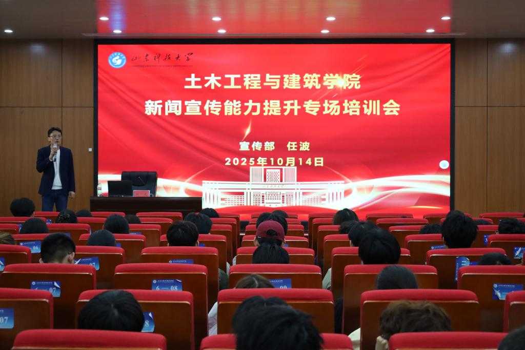为提升学院学生干部的新闻宣传能力,为学院宣传工作注入新活力,10月14日,土建学院在J15-136举办新闻宣传能力专题培训,本次培训特邀学校宣传部任波老师主讲,学院新闻中心、学生会和班级主要学生干部等百余名学生参加培训。