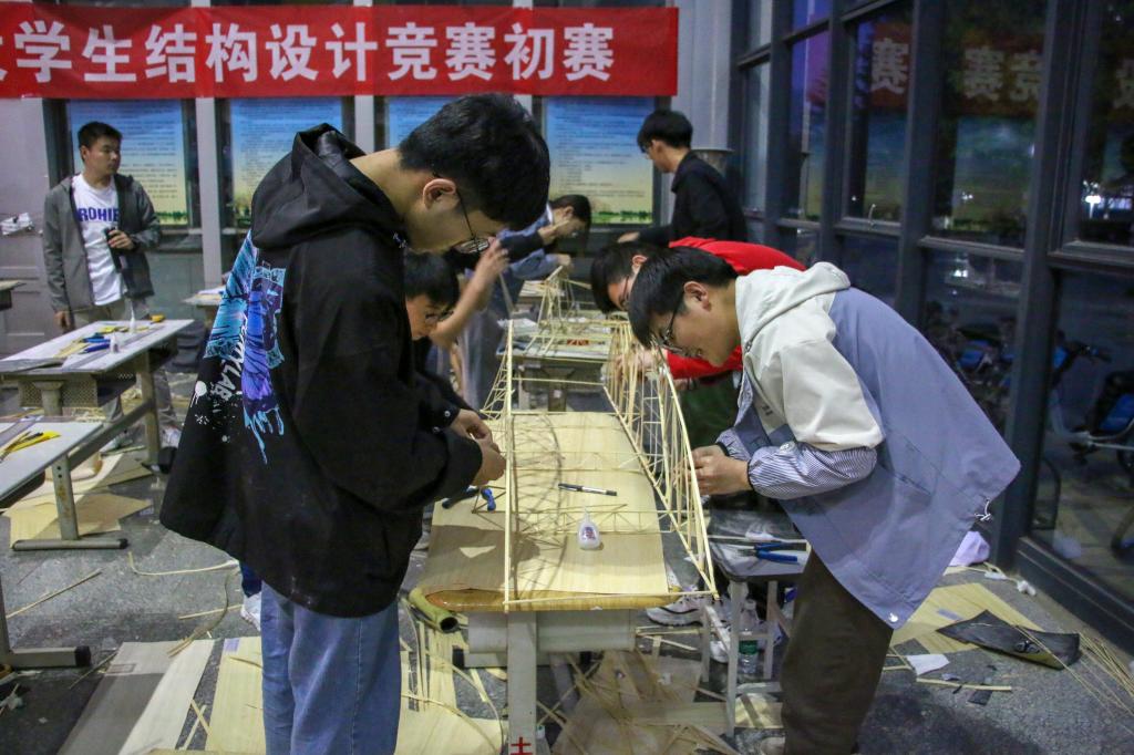 经过经验分享会、赛前赛题讲座等筹备活动,选手们对结构设计、赛品质量、加载承重等方面做好了充分准备。上午8时,比赛正式拉开帷幕,学院党委副书记高静致开幕词,她鼓励同学们多一些创新,多一些实践,希望同学们将所学知识活学活用,预祝大赛取得圆满成功。建筑工程系副教授林跃忠在辅导员鲍娜娜陪同下现场指导,对设计过程中出现的明显失误及时提醒。参赛队员配合默契,争分夺秒,精心设计。经过十个小时的制作过程,截至下午6点,共有41支队伍完成赛题制作。制作结束后,工作人员对各组模型进行现场称重。