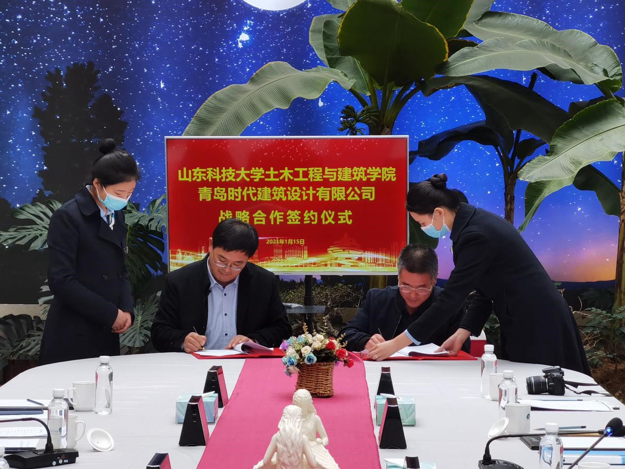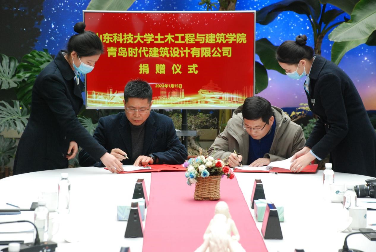 宋西路和于海鹏共同为“山东科技大学大学生就业创业实践基地”“山东科技大学教学实践基地”揭牌,并代表双方签署《校企合作协议》《BIM合作协议》等4份协议。薛力、青岛时代建筑设计有限公司综合办主任沈新宇代表双方签署《奖学金捐赠协议》等2份协议。