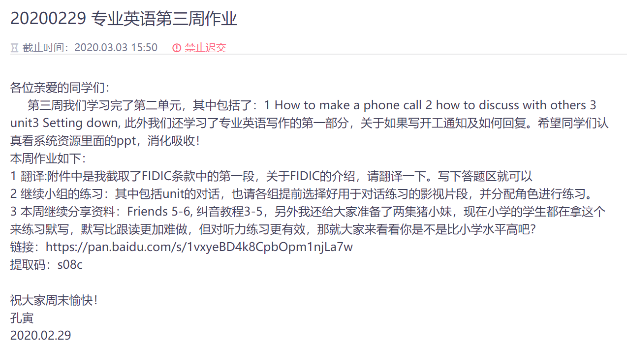 工管系孔寅老师的《建筑企业管理》课程采用的是智慧树平台语音直播,学生使用知到App在线听课。上课期间老师可以通过随机点名来检查学生是否在线听课,也可以点名后让学生弹幕来回答问题。课前课后则利用智慧树平台来布置预习任务和课后作业,设置截至日期。同时,借助智慧树现有的一门《企业管理》课程来建立了异步SPOC(Small Private Online Course,小规模限制性在线课程),可以通过学情数据来及时了解学生课下自学慕课的情况。孔寅老师教授的另一门课《专业外语》,则是使用了雨课堂的视频直播,同时借助于中国大学Mooc的《商务英语口语与实训》来建立异步SPOC让学生课下自学。工管17-1班于丽娜反馈到,“孔寅老师会不定期抽查学生小组合作练习的口语对话以及我们每日听读China Daily后在喜马拉雅上的录音等,她再对我们的发音进行点评纠正。同时,孔老师经常分享双语美剧等资源,传授好的学习方法,拓展我们的视野思维”。